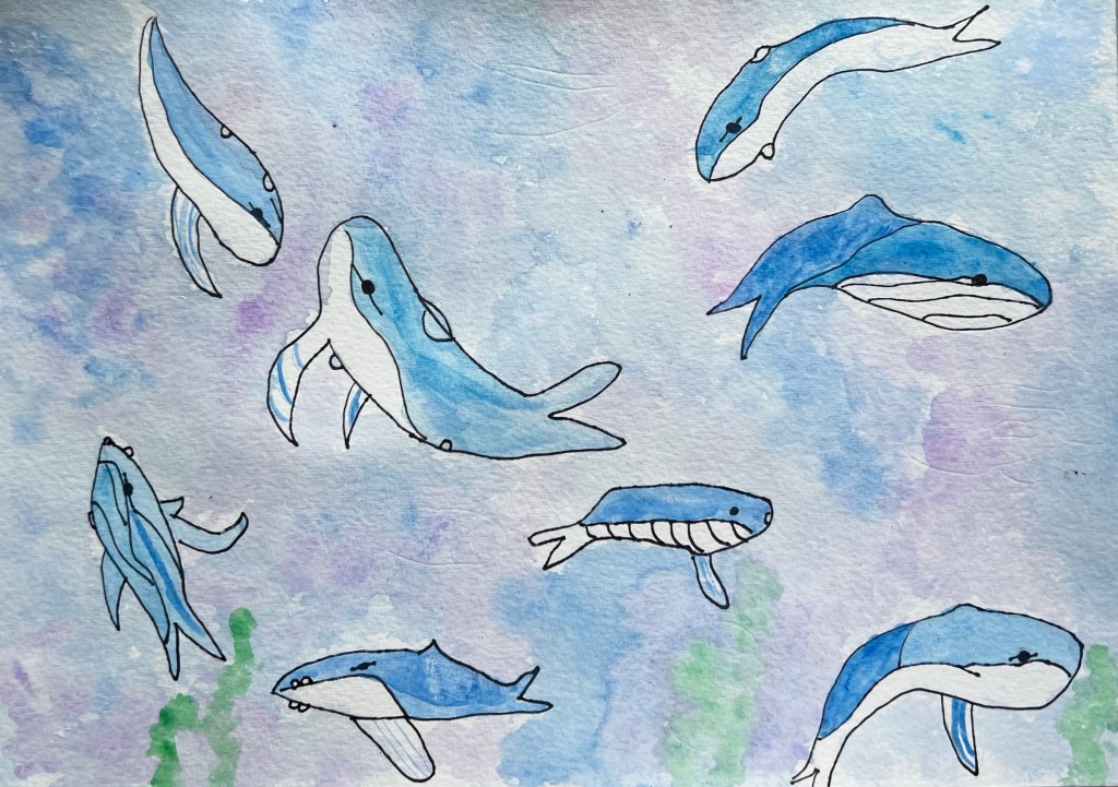 Watercolour whales by Dalila – Art-K tutorialwas asked not to paint the other fish and told this is the complete tutorial. Prefer the whales on their own without the clear paper on top. The idea is that some fish looks further away in the background with the clear paper.